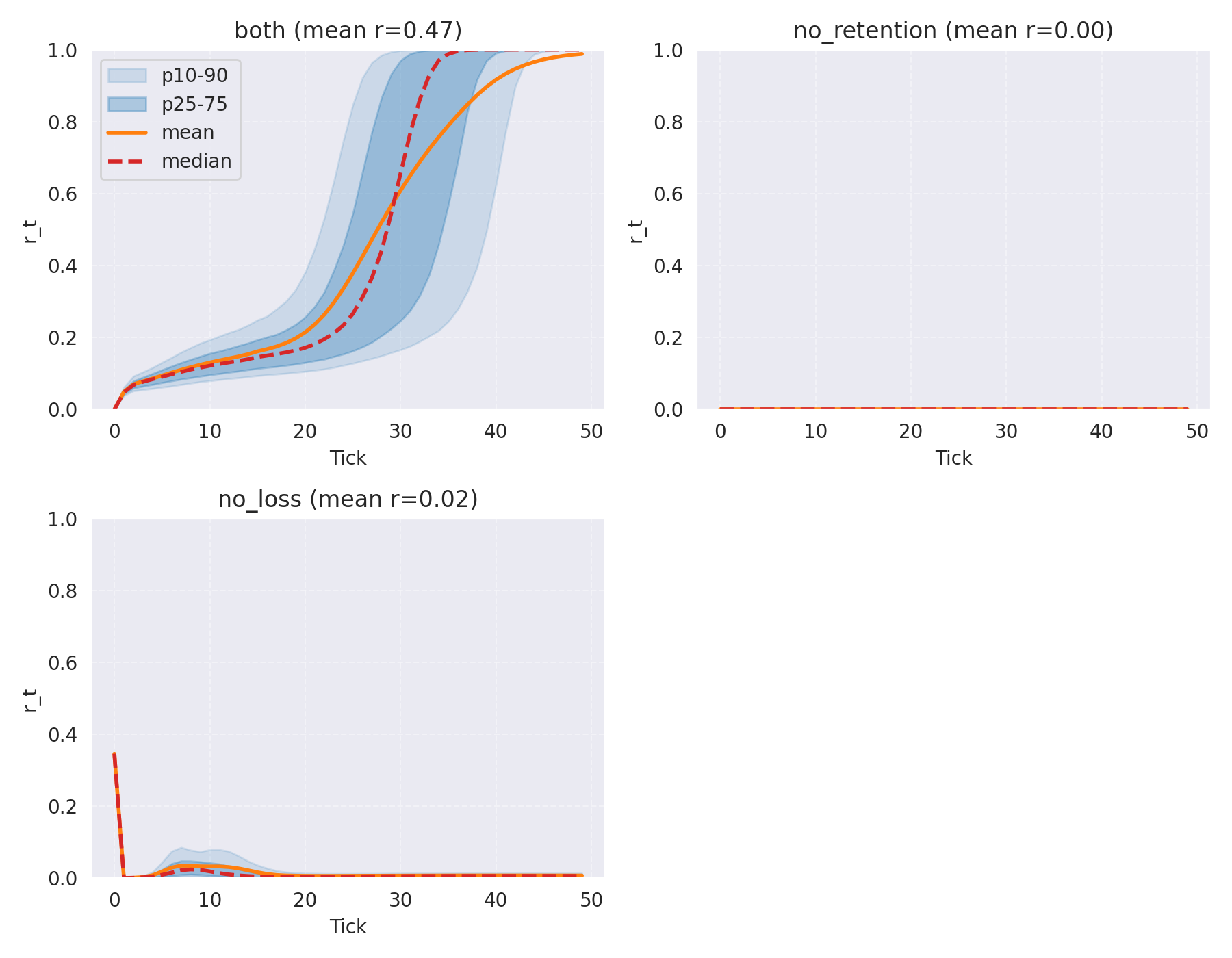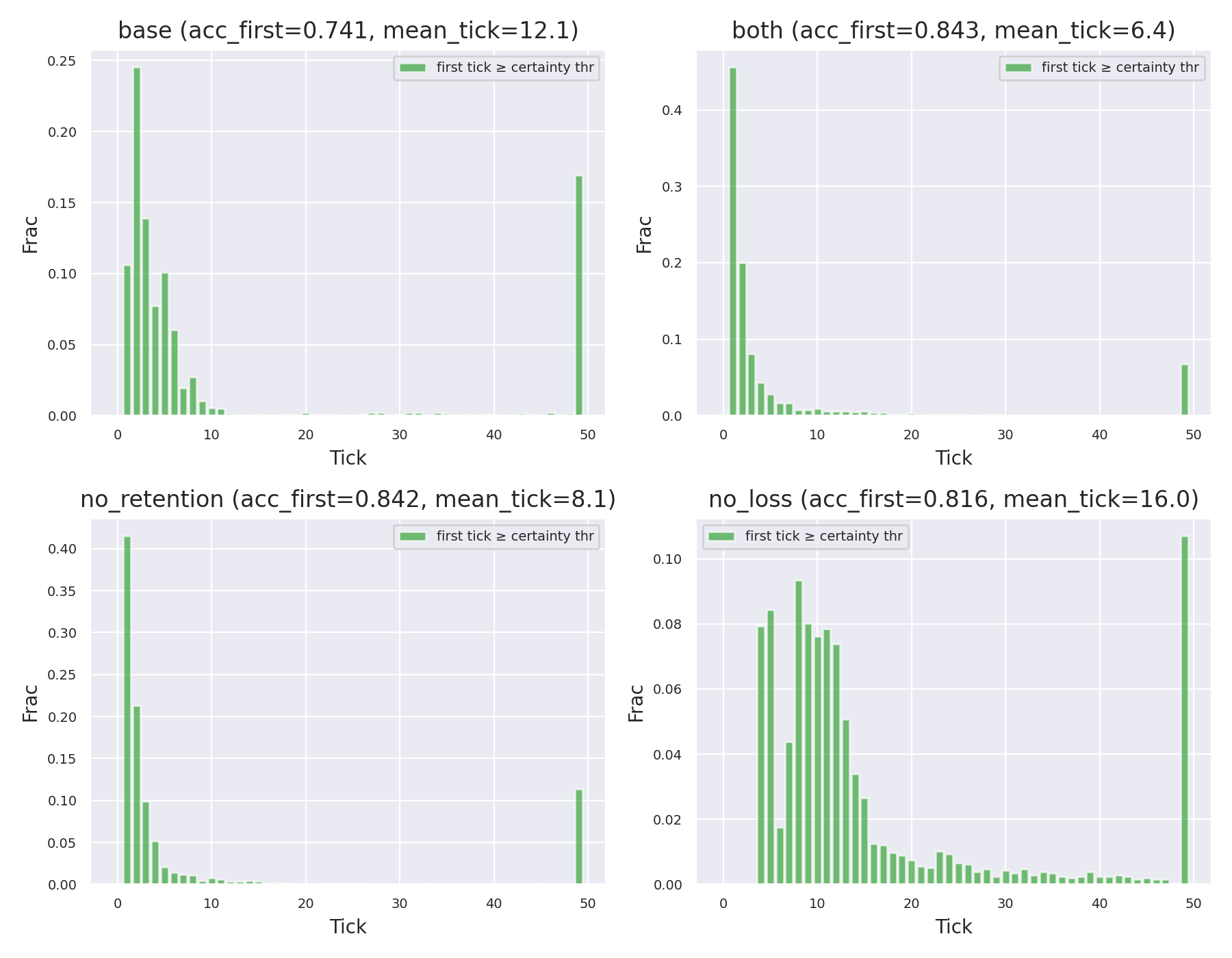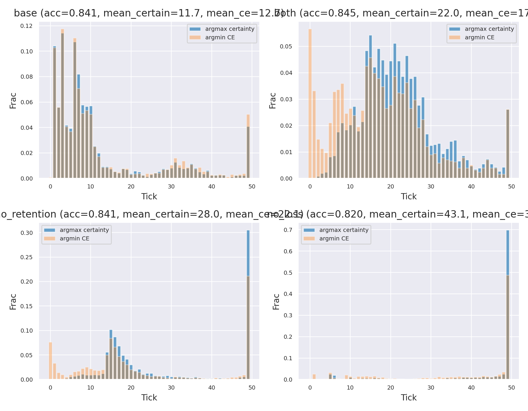 Figure 3: Distribution of certainty. The baseline (blue) is impatient; the "both" version takes its time. ### Per-Tick Performance