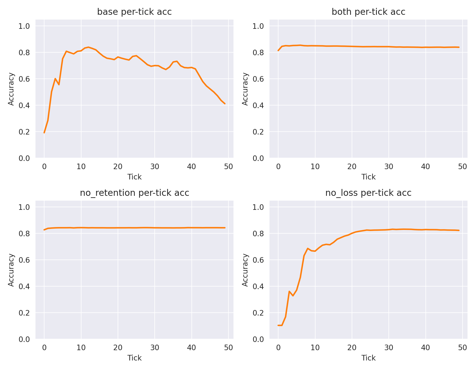 Figure 4: Baseline accuracy falls off a cliff over time, while our version stays flat. This tells us the model isn't necessarily finding new info in those later ticks—it's just organizing its existing beliefs better.
