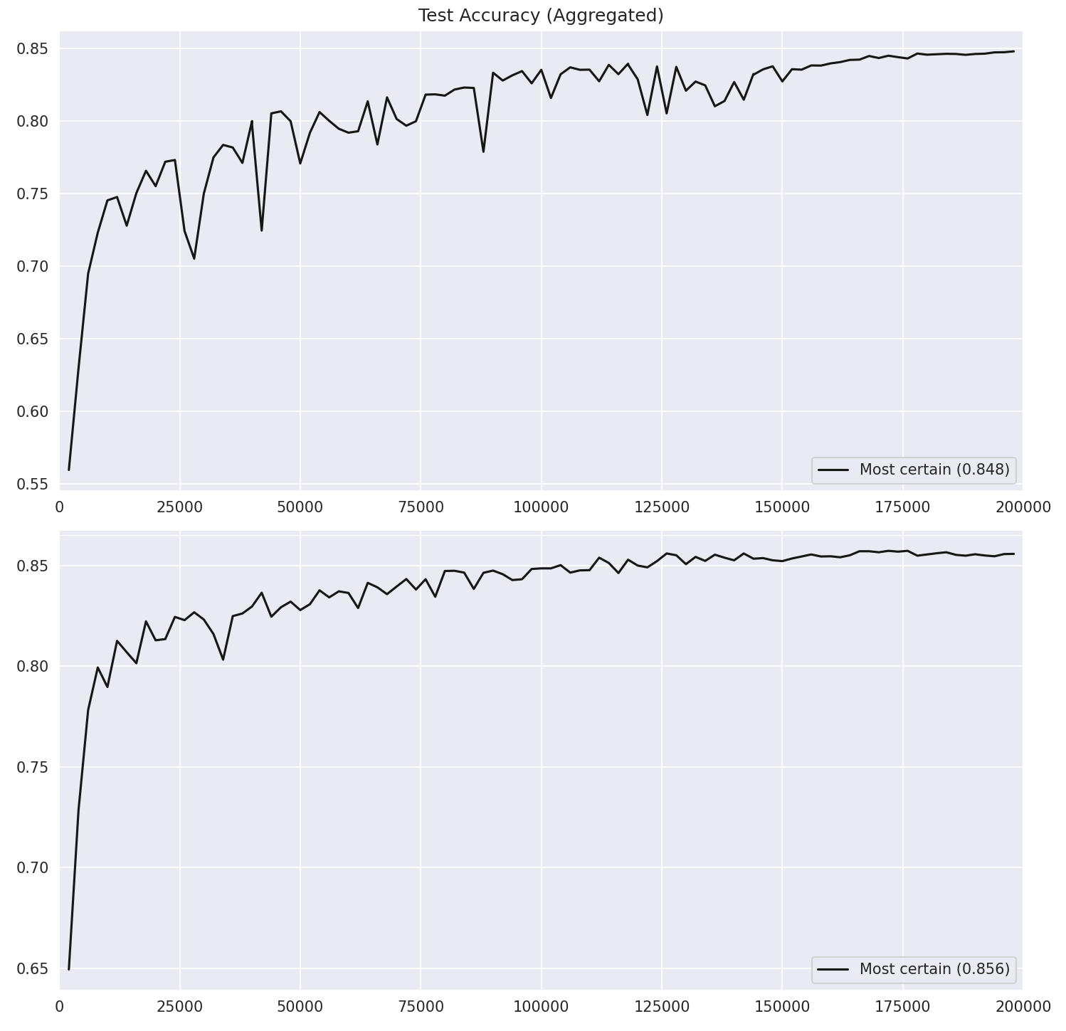 Figure 1: Test accuracy. Notice how the "both" condition (bottom) is much less jittery and hits higher peaks. That said, there’s no free lunch. The "both" condition overfits like crazy. By giving the model more capacity and more specific supervision per sample, it becomes very good at memorizing the quirks of the training set.
